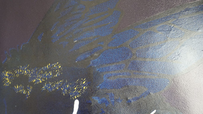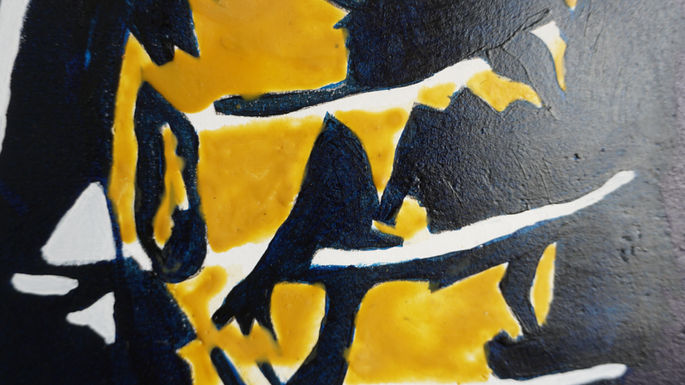 Acrílica, encáustica e transferência por solvente sobre papel reciclado e gesso.